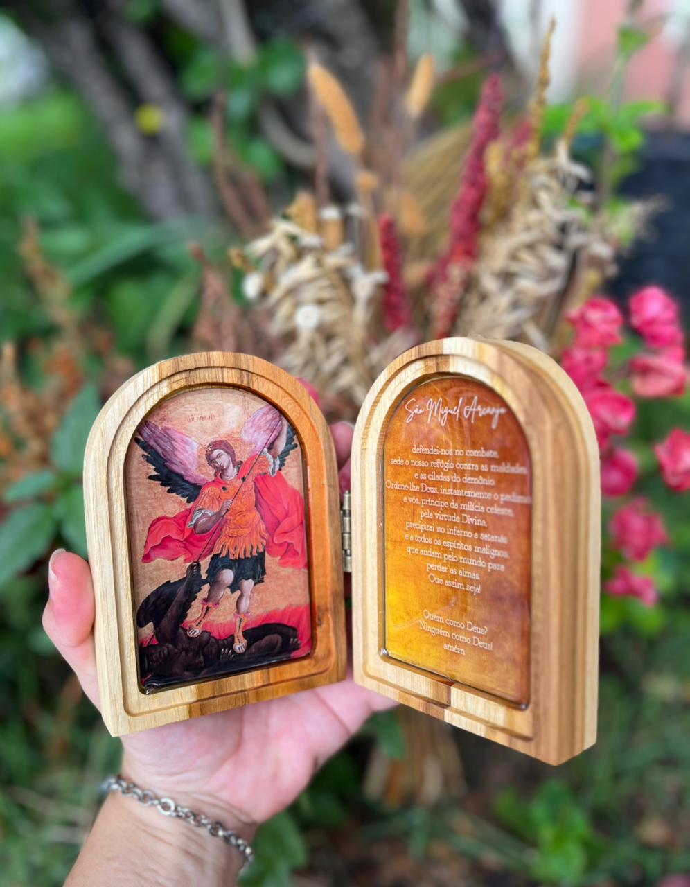 Díptico em madeira nobre entalhada, com estampa de alta qualidade e resina incolor de proteção sobre a estampa.