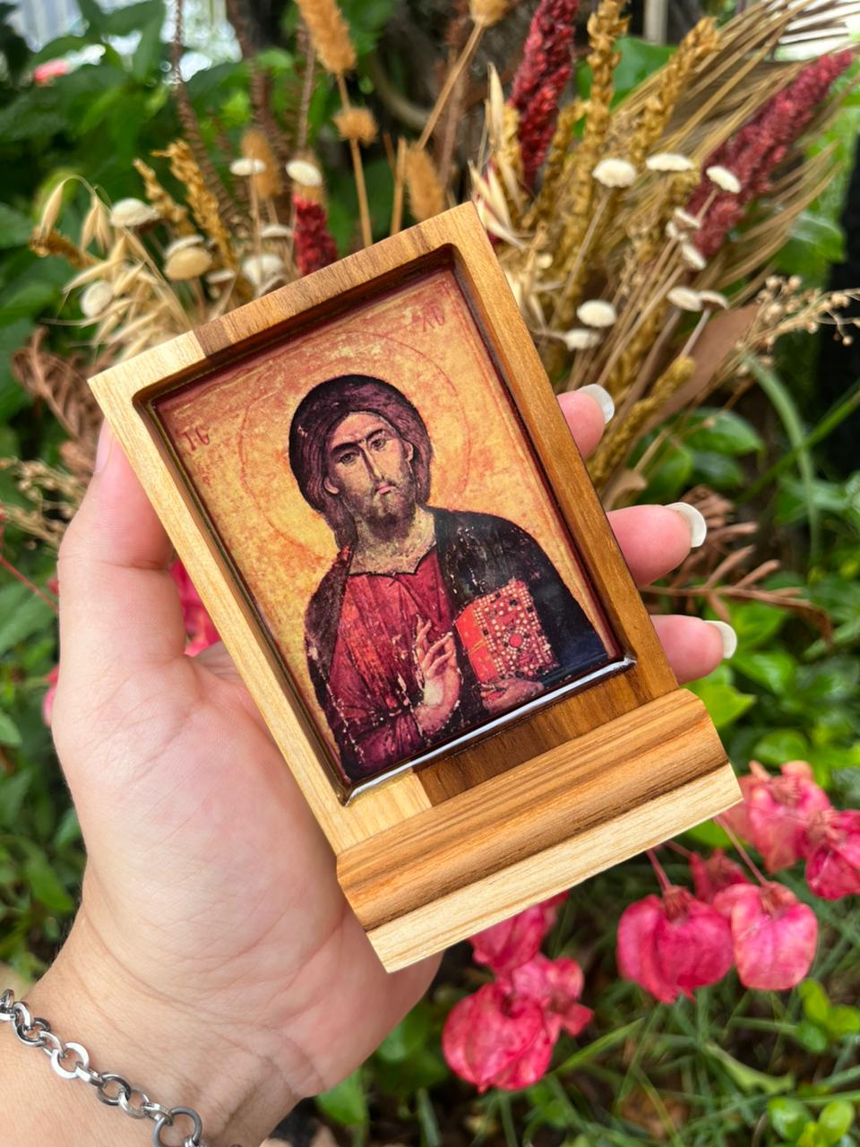 Mini ícone em madeira nobre com estampa impressa em alta resolução, imagem resinada com proteção UV.
