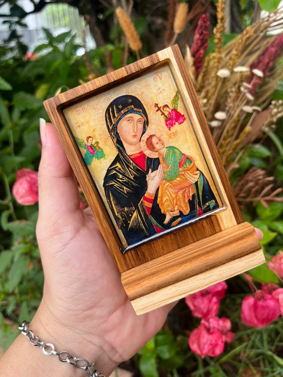 Mini ícone em madeira nobre com estampa impressa em alta resolução, imagem resinada com proteção UV.