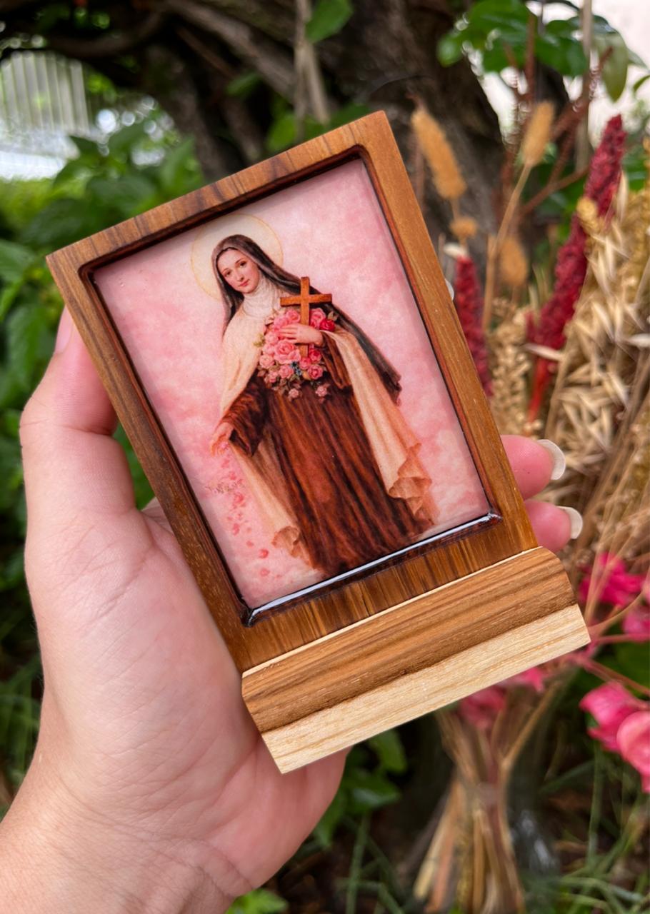 Mini ícone em madeira nobre com estampa impressa em alta resolução, imagem resinada com proteção UV.